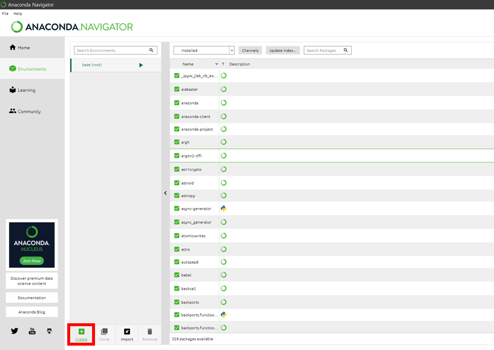 실행한 후 왼쪽 메뉴에서 Environment를 클릭해 Create 버튼으로 새로운 가상환경(env)를 생성한다.
