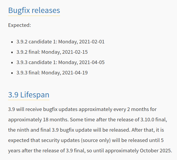 2021.01.15 기준 3.9.1(2020.12.07 Release)이 최신 버전이며 앞으로의 스케줄은 이렇다고 한다